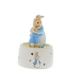 Beatrix Potter Mrs Rabbit & Peter Rabbit Musical Size: 12cm H x 8cm W x 8cm D This charming and traditional Mrs. Rabbit and Peter Rabbit Musical makes a lovely traditional gift or nursery keepsake that children and parents alike will love and treasure forever. Wind up with the key and watch your favourite characters gently twirl around to the soothing sounds of Au Clair De La Lune.