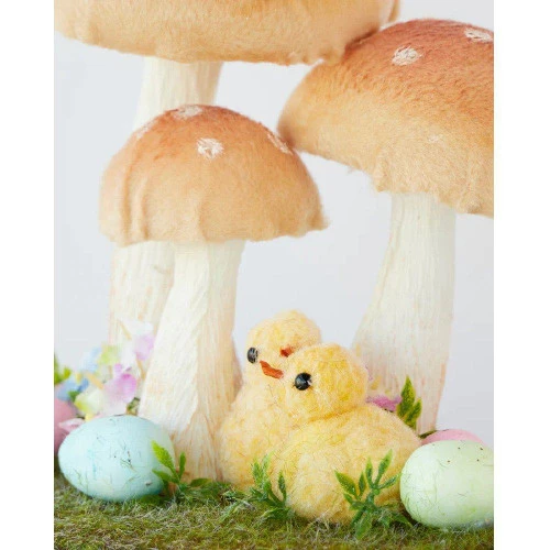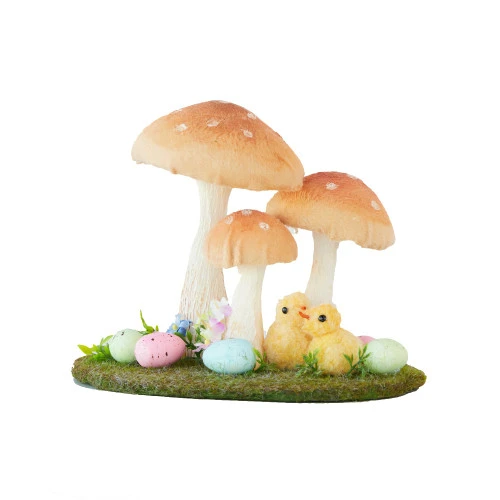 Chicks In The Meadows Size: 20cm The meadows are a favourite place for two yellow chicks to hang out and relax and they enjoy playing under the big mushrooms that are always growing up there. This endearing display is sure to be a hit with any occasion. Also, there are colourful eggs waiting to hatch, and once they do, everyone will have a blast playing together.