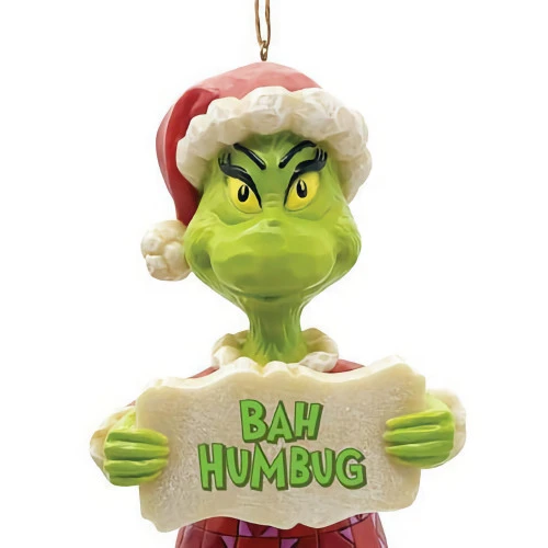 Dr Seuss Grinch Bah Humbug Hanging Ornament Size: 13cm H x 4.8cm W Introduced: 2021 Celebrate another season with Dr. Seuss by Jim Shore! Be sure to hang the Grinch Ornament your tree this season. He has a classic smirk, dressed as Santa and holding “Bah Humbug” sign Presented in a branded giftbox
