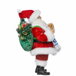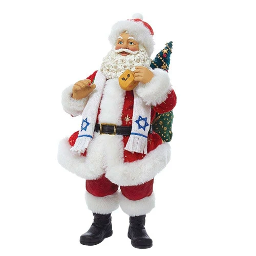 Fabriché – Santa Claus holding Dreidel Size: 28cm Santa Claus is holding a dreidel, a small four-sided spinning top with a Hebrew letter on each side and wearing a white and blue star tallit. A fun and festive addition to your Christmas décor. Perfect for interfaith families. Part of the Kurt Adler Fabriché™ collection. Made of plastic, polyester and fabric mache