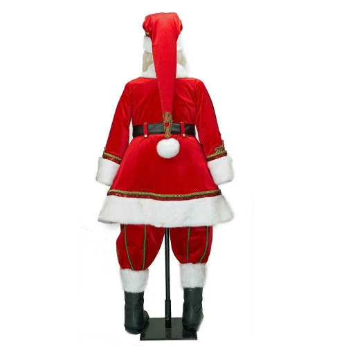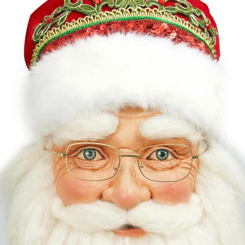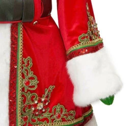 Katherine’s Lifesize Jolly St Nick (Santa’s Coming To Town) Size: 167cm This charming Jolly St Nick would be a great addition to add at your entrance or amongst your Christmas decor. He has a fluffy white beard and gold glasses with blue eyes peeping through. His read coat is lined with gold and green embroidery, gold buttons hold the front of his coat closed above a black belt with an ornate gold buckle. The end of the sleeves and base of the coat has a red sequins and gorgeous green and gold embroidered pattern with red jewels. His red pants have emerald green stripes leading down to his black boots with red laces! The Santa’s Coming To Town collection is playful and fun. Whether you’ve been naughty or nice this year, the jolly Santa featured in this theme will gladly bring good cheer to any home. Vibrant greens and a bold cerise are sure to awaken the holiday spirit in even the most curmudgeonly naysayers. Katherines Collection continues to surprise and delight with a range of unique Christmas decorative themes. It takes a team of skilled artisans from sculptors to fashion designers … to produce tabletop pieces, decorative hanging ornaments and original character dolls. Each Katherines piece is finished to an exceptional standard and uses quality embellishments such as jewels and haberdashery trimmings.