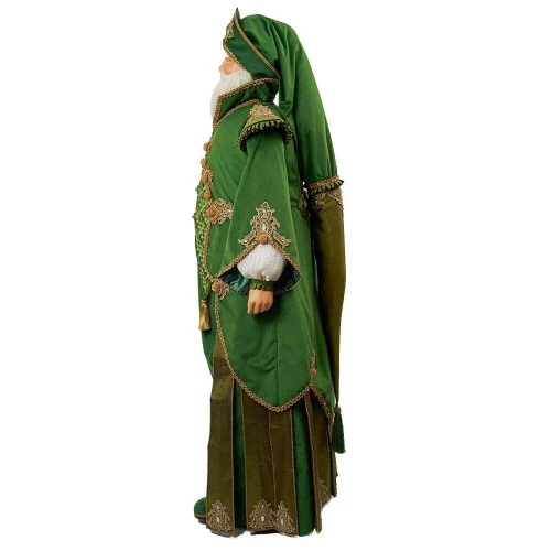 Katherine’s Lifesize Nicholas Green Santa (Evergreen Lane) Size: 167cm Our Nicholas Greene Santa Display Figure has a handcrafted face with a beautiful poise. He is an exquisite Christmas showpiece decoration. He wears a beautifully designed full-length, fern green coat with a gorgeous basket weave ribbon waistcoat, hat and pants. Embellished with gold braid trims, tassels, beads and jewels. The Evergreen Lane collection has exquisite shades of green with gold embellishments to create this Katherine’s Collection winter theme. An owl table topper, swan bowl, and three different angels give this line the wings to soar. The handcrafted face of each doll reflects the poise and creativity of the artists. Katherines Collection continues to surprise and delight with a range of unique Christmas decorative themes. It takes a team of skilled artisans from sculptors to fashion designers … to produce tabletop pieces, decorative hanging ornaments and original character dolls. Each Katherines piece is finished to an exceptional standard and uses quality embellishments such as jewels and haberdashery trimmings.