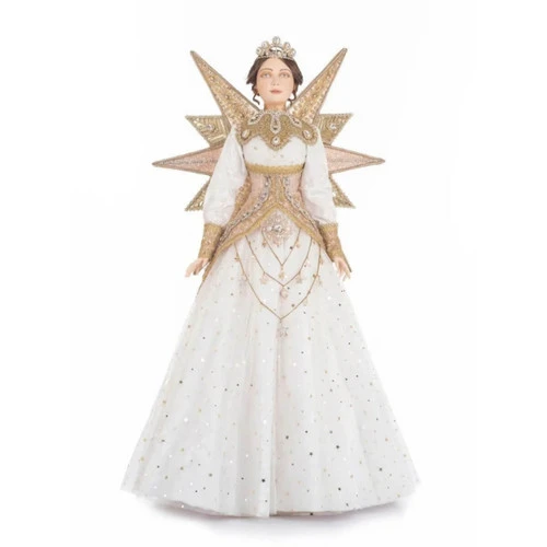 Katherines Celestial Angel Doll Size: 81cm This lovely angel has the most stunning brown hair, and her golden crown is absolutely breathtaking. Her collar and cuffs are also made of gold and decorated with gold embroidery and jewels, as is her waistband, which is cinched in with gold cloth. There are a few rows of chain with gold star charms hanging from it below the bodice. The chain is in several rows. Her gown is made of white tulle and features glittering gold stars of various sizes embroidered all over it. There is a large star adorned with exquisite beadwork, glitter, and gems that is located behind her.