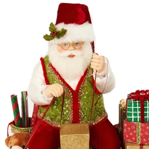 Katherines Collection Santa In Slippers Wrapping Presents Size: 38cm How adorable is this Santa? comfortably dressed while putting the final touches on a gift. Wearing a sequin vest and reindeer slippers. Surrounded by multi coloured, beautifully wrapped gifts. A charming festive piece for your mantel, coffee table, desk, or shelf. The perfect accent to complete your home or office decor. Katherine’s Collection have designed and produced both stylish and sophisticated decorative Christmas themes for more than 20 years. Based in Ohio, USA the team of designers, dress makers and decorators continue to excite customers across the world. They have developed Christmas decorations in a wide range of bright and original colours, making new themes and trends for Christmas, Easter and Halloween year after year. The Christmas Elves team are excited to present our latest Katherine’s range with a variety of Santa & Mrs Claus figures for you to choose from, dressed in elegant suiting with gold brocade or the traditional red and green velvet. The Katherine’s range is completed with small custom design festive and functional pieces to lifesize figures of many of our popular holiday favourites. The set has a variety of different adorable items that you’ll love to have. Choose from a variety of delightful ornaments, accessories, figurines, ribbons and decor. They make really great conversation pieces at any social gatherings. You will surely fall in love with any piece from our new Katherines Collection range.