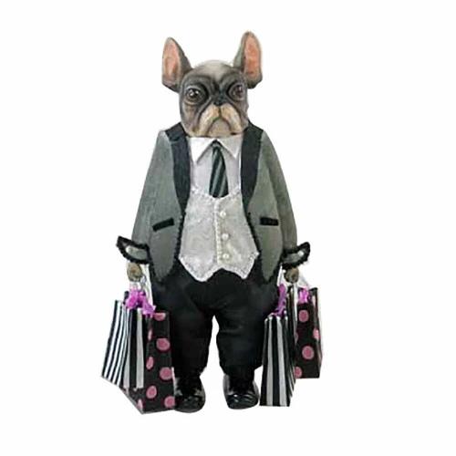 Katherines Fifi French Bulldog Shopping Size: 30cm This french butler bulldog is dressed in his best tuxedo and holding bags of shopping. This would look great in your entrance!