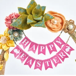 Katherines Happy Easter Basket with Chicks Size: 28.5 cm x 23.5 cm x 38.5 cm The Easter basket is a beautiful decorative item from the Katherine’s Collection brand. It features a fun colourful vintage feel with 2 chicks playing, “Happy Easter” flag sign draped across and beautifully detailed flowers and lace trim. It adds a refreshing Spring element to your tabletop festive display. Only a limited addition available