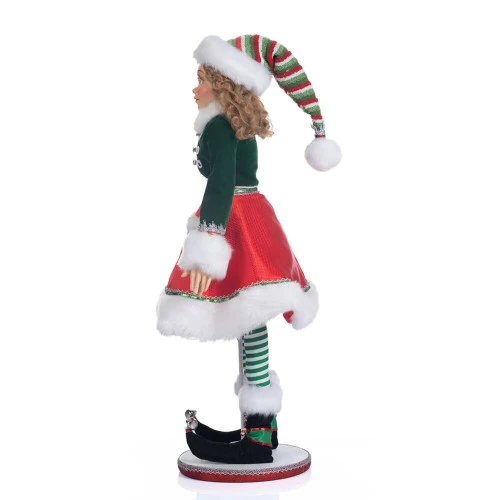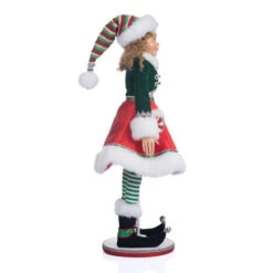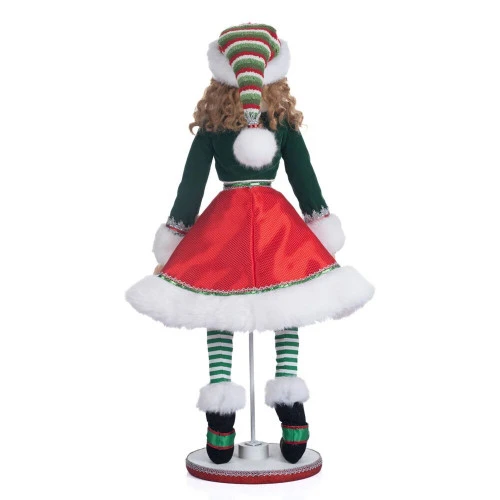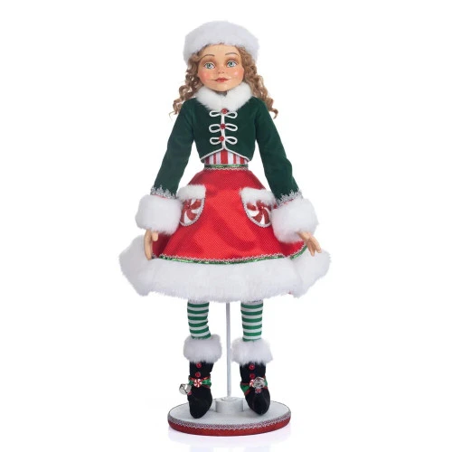 Katherines Mint The Christmas Elf Size: 67cm Peppermint Palace Mint the Elf Doll is a charming addition to your holiday decor. Create your own sweet scene with the help of this charming festive doll. Green crop jacket with contrast white faux fur trim, red flouncy skirt and striped leggings. Embellished with candy details, sequins, and braid trim We’ve been selling unique character dolls and other handcrafted items to satisfied customers for 30 years now. Katherine’s Collection can bring any Halloween, Christmas, or Valentine’s Day fantasy to life.