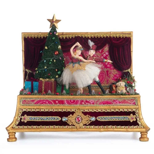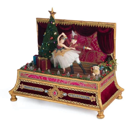 Katherines Nutcracker Dancing Hinged Box Size: 35.5cm A beautiful golden box lined with velvet and adorned with paisley and jewels. There’s a Christmas tree and some nicely wrapped presents inside, and Clara and the Nutcracker are spinning around. A beautiful addition to your fireplace mantel or coffee table!