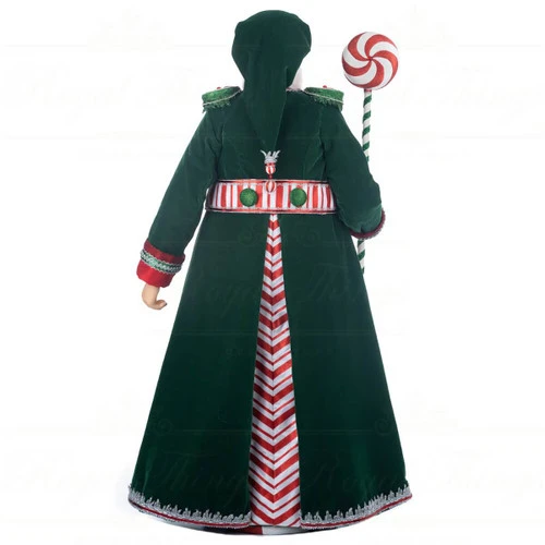 Katherines Papa Peppermint Santa Size: 81cm Santa is dressed in a gorgeous floor-length green velvet jacket with red, silver and peppermint striped pleats. He has green jewel buttons and a white button-up shirt with silver embroidery on it. He is wearing black boots with scarlet red slacks and holds a staff with a peppermint candy on top.