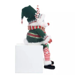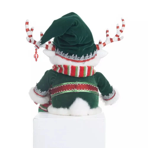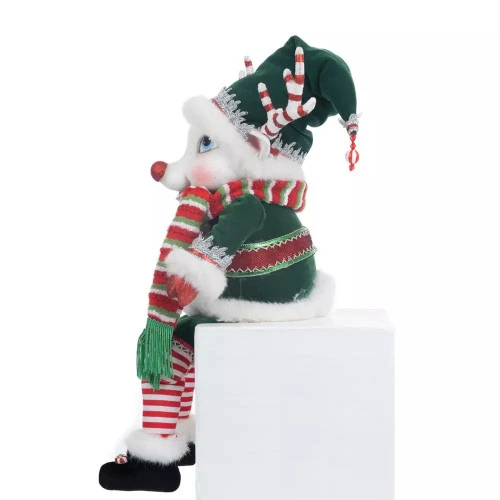 Katherines Peppermint Palace Reindeer Lanky Leg Size: 42cm This tailor made reindeer would look adorable hanging over a mantle or perched on the edge of a coffee table! She is decked out in a full Christmas ensemble, including a green velvet coat with candy buttons, stripe knit scarf, red glittered mittens, and a green Christmas hat.