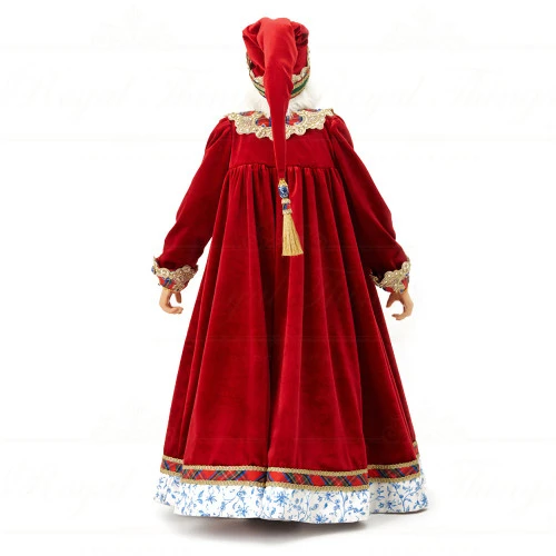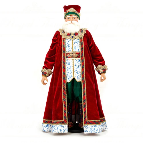 Katherines Santa with Red Robe Size: 86cm Santa has on a red velvet coat that is embellished with gold embroidery and plaid trim. He is also wearing a blue and white chinoiserie top with gold trim, a plaid belt around his belly. The green pants are tucked into gorgeous plaid boots with gold accents Katherines Collection continues to surprise and delight with a range of unique Christmas decorative themes. It takes a team of skilled artisans from sculptors to fashion designers … to produce tabletop pieces, decorative hanging ornaments and original character dolls. Each Katherines piece is finished to an exceptional standard and uses quality embellishments such as jewels and haberdashery trimmings.