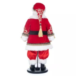 Katherines St. Nicholas North Doll Size: 61cm Put this gorgeous Santa on display this year on your mantle or coffee table! Santa wears a plush red velvet coat with white fur trim and gold trim details. Tied by a strong black belt, showing off a gold embroidered shirt with emerald green jewel buttons. The fine gold embroidery extends to his footwear and top hat.