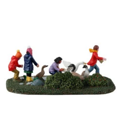 Lemax Duck Duck Goose It would be more appropriate to call this game goose, goose, kid! One of the geese, upon realising that food was heading its way, makes the decision to pursue the source of the food rather than wait for it to come to them. This fun outing in the park, which is depicted so beautifully, would be a charming addition to any village scene you could imagine. Size: 5.8cm x 15cm x 9cmYear Released: 2023Made of: ResinProduct: Table PiecesElectrical: Non-Electrical