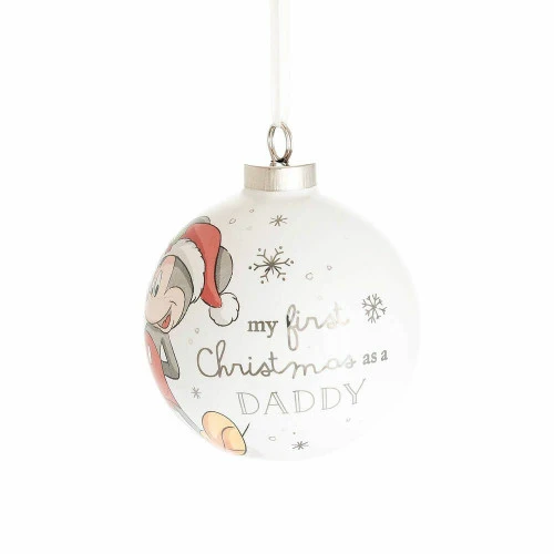 Magical Christmas Bauble Mickey “Daddy” Size: 8cm Bring the Christmas tree to life with some Disney magic! This charming bauble features an illustration of Mickey Mouse wearing a Santa hat with caption ‘My First Christmas as a Daddy’. A gorgeous gift!