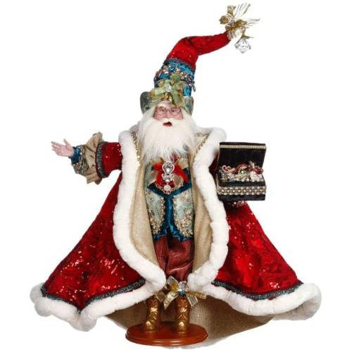Mark Roberts Santas Treasure Chest Size: 62cm Dress your home this Christmas season with Mark Roberts collectable Santa who holds a chest box full of wonderful gems. He wears his stunning red velvet coat with beautiful sequin detail, trimmed with faux fur. His vest, sleeve and hat embellished with crystal jewels and bows. A great piece to add to your mantle, table top or amongst your decor. Release Year: 2021 Mark Roberts Limited Edition Christmas Collectibles pair elegant design with holiday whimsy. Sure to be cherished as heirlooms, the collectibles figurines wear fine costumes, carry ornate accessories, and feature quality craftsmanship. Every Mark Roberts Limited Edition Christmas Collectible comes with a Certificate of Authenticity and an invitation to register for our own Christmas Elves Collectors Club.