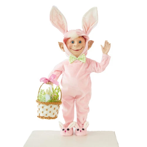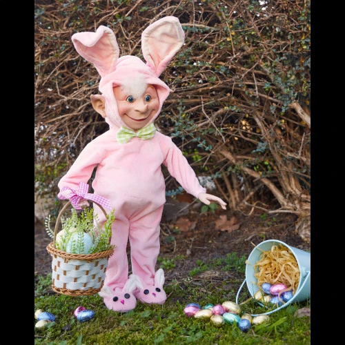 Ralphie The Pink Bunny Elf Size: 45 cm Ralphie Bunny Elf dons a rabbit costume, hops around the yard, and searches for chocolate treats so that he can eat them. Ralphie Bunny Elf is geared up and ready to guide children to the delicious chocolate treats that await them. Put her on your tabletop or among your other Easter decorations.