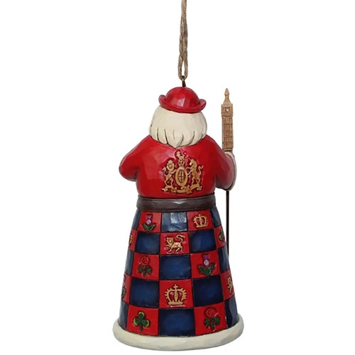 Jim Shore Santas of the World British Santa Ornament Size: 10cm Santa enjoys a cup of tea while he holds a Tower of London staff, his robes hand-carved with royal crests and a classic London skyline. High-quality stone resin. Released January 2018