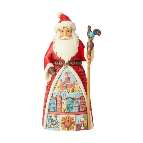 Jim Shore Portugese Santa Size: 18cm Portuguese Santa celebrates a country of rich culture with many colours. A scene of the painted city is framed by Santa’s lavishly textured robe. The Jim Shore Around the World Santa holds a staff topped with an emblem of Portugal, the rooster of Barcelos. Made from Stone Resin Introduced January 2019