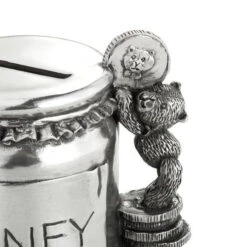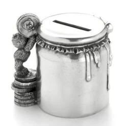 Teddy Money Box Coin Jar Size: 7cm With the beautiful muted lustre of pewter, this charming Money Jar features a gorgeous little bear climbing a tower of coins to deposit his own. Charmingly displays the word ‘Honey’ with the ‘H’ crossed out and replaced with an ‘M’. As the little bear must surely know, it’s never too early to start saving! It would be a gorgeous gift for a newborn, christening or 1st birthday which will eventually become cherished treasures of the future. Royal Selangor has a dedicated and passionate design team that presents new additions to the range yearly. Creating unique and treasured products that last the test of time Beautifully presented in a Royal Selangor gift box.