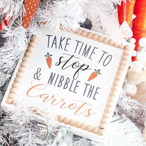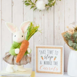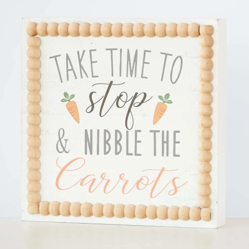 Time to Nibble the Carrots Sign Size: 20cm Your Easter decorations won’t be complete without the charming sign that reads “time to nibble the carrots.” A wooden sign to accompany the other wooden decorations you have chosen for your Easter celebration.