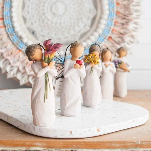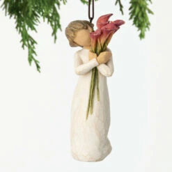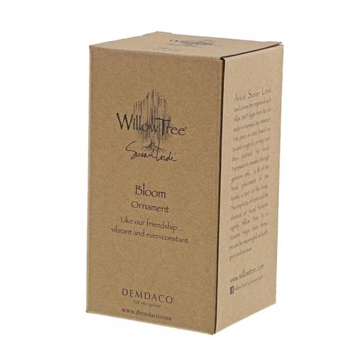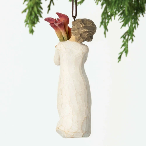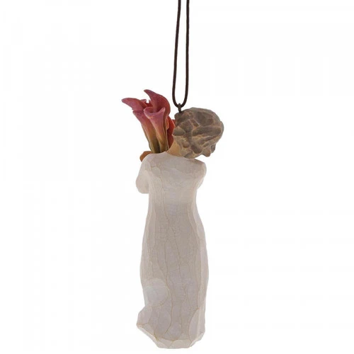 Willow Tree Bloom Ornament Size: 11cm “Like our friendship… vibrant and ever-constant” Figure in cream dress, holding tall bouquet of fuchsia calla lilies. Hook and loop affixed to figure’s head. A gift that expresses friendship and caring… or for those who love flowers! “Calla lilies are a fresh surprise – uplifting in shape; invigorating in colour. I wanted to express their vibrancy with a gradation of colour that builds, starting as limey green, morphing to beautiful coral, tinged with wine. And calla lilies also have a long blooming season… So the qualities of this flower represent supportive, constant friendship. The kind of friend who stays by our side, lifting our spirits through the best and the worst.” – Susan Lordi Hand-painted resin ornament. Brown elastic cord for hanging. Dust with soft cloth or soft brush. Avoid water or cleaning solvents.