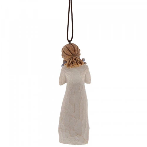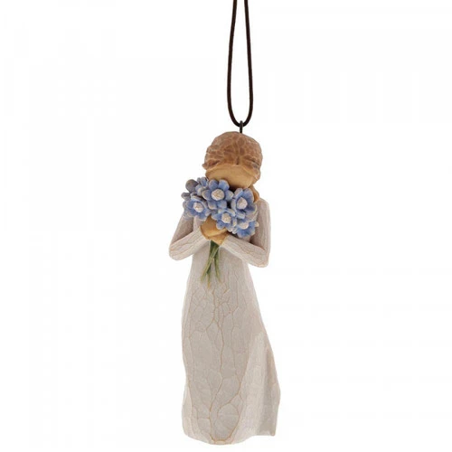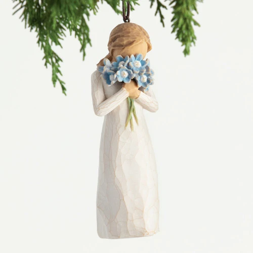Willow Tree Forget-me-not Ornament Size: 10.5cm “Holding thoughts of you closely” Figure in cream dress, holding large bouquet of blue forget-me-not flowers up to face. An expression of love, friendship and caring… or a gift to express sympathy, comfort and healing…or for those who love flowers! Forget-me-not is a thinking of you piece, with a universal message. She represents timeless friendship and love that spans any distance. She’s also another flower to add to the garden of colorful figures that include Sunshine, Beautiful Wishes, Surrounded by Love, Bloom and Happiness. Hand-painted resin ornament. Brown elastic cord for hanging. Dust with soft cloth or soft brush. Avoid water or cleaning solvents.