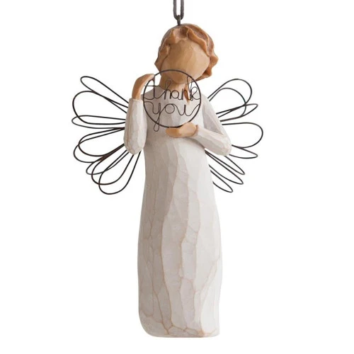 Willow Tree Cream Ornament Just for You Size: 10cm “With sincere thanks” Angel in cream dress with wire wings, holding words ‘thank you’ written in wire inside wire circle. A gift to express appreciation and thankfulness for teachers, volunteers, donors, caregivers, friends. “I try to keep the interpretation of Willow Tree open. I hope this makes it more personal, and allows the viewer to decide its meaning…” – Susan Lordi Hand-painted resin ornament with wire wings. Brown elastic cord for hanging.