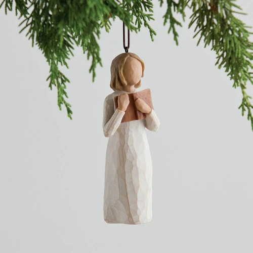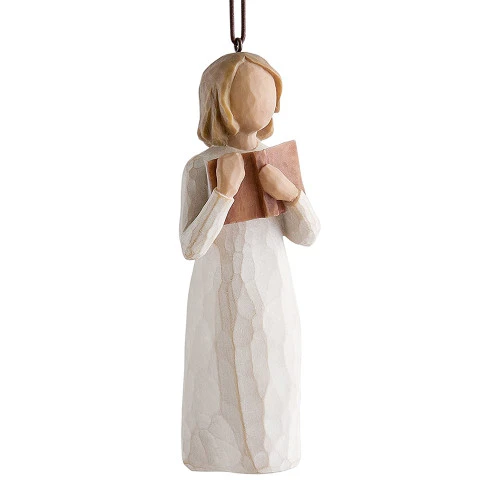Willow Tree Cream Ornament Love of Learning Size: 10cm “Open books, open minds” Figure in cream dress holding open book to her chest. A gift for graduates, students, teachers, caregivers… or to celebrate special accomplishments. “I try to keep the interpretation of Willow Tree open. I hope this makes it more personal, and allows the viewer to decide its meaning…” – Susan Lordi Hand-painted resin ornament. Brown elastic cord for hanging.