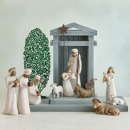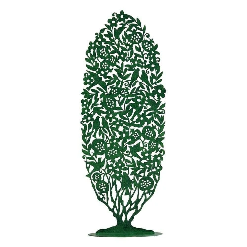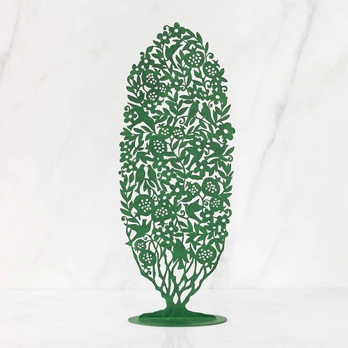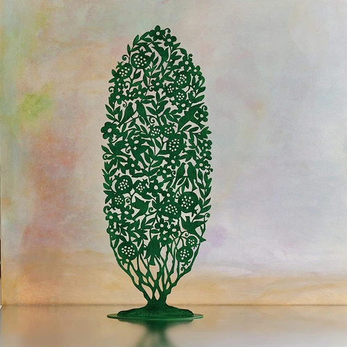 Willow Tree Nativity Green Tree Silhouette Backdrop Size: 36.5cm ”A presence of life and light” This two-dimensional green tree silhouette is formed of thin, pierced metal. It has been designed as an accessory piece for the Nativity collection or The Christmas Story collection. It adds an architectural element of colour and texture to either scene with images of birds, leaves, pomegranates – symbols of life and light. “This piece reflects the love and reverence of trees – their graceful, columnar, beckoning, magical qualities. They have so much character and gesture. When I look up at the canopy of trees in the sunlight, the leaves look dark and lacy… a silhouette of beautiful shapes where the light comes through. I like to look at the delicate patterns created.” – Susan Lordi Pierced metal, painted by hand. Dust with soft brush or cloth.