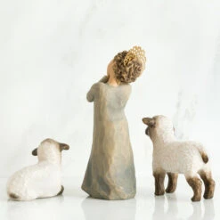 Willow Tree Nativity Little Shepherdess Figurine Size: 12.7 cm “Behold, a little love on earth” Standing figure in blue-gray dress, with hands up to chin, wearing crown of pierced gold filigree of hearts. Two white sheep: one lying down, one standing with dark face and feet. “I view this angelic figure as an earthly personification of love. Her gaze and gesture is one of adoration. The smoky blue colour of her dress grounds her, as do the two wooly lambs she tends. I wanted her to complement the taller shepherdess figure, Peace on Earth. Together, with the other shepherds and animals, they radiate warmth, love and peaceful attentiveness.” – Susan Lordi Hand-painted resin figure and two sheep. Dust with soft cloth or soft brush. Avoid water or cleaning solvents.