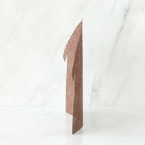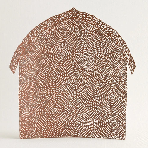 Willow Tree Nativity Shelter for The Holy Family Size: 24 cm Arched, rust-colored pierced-metal backdrop, patterned with branches and swirling circles of dots. Sized to complement The Holy Family nativity set. This pierced-metal backdrop was created to complement The Holy Family, though it can be used as a beautiful backdrop for other angels or figures as well. “The repetitive swirling concentric mark-making is suggestive of twinkling stars at night. The roof is an intertwined, organic structure that suggests a bower of twigs or branches. Since the surface patterning is complex with tiny elements, I wanted to pare down the form to the simplest possible. It’s basically a single sheet of pierced metal, curved to allow it to stand and represent a shelter for The Holy Family and animals.” – Susan Lordi Formed of thin, pierced metal and painted by hand. Dust with soft cloth or soft brush. Avoid water or cleaning solvents.