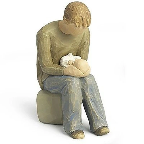Willow Tree New Dad Figurine Size: 15cm “In awe and wonder of what’s to come” Seated figure in cream shirt and blue jeans, holding newborn infant on his lap. A gift to celebrate new beginnings, new babies, new families… and the loving relationship that develops between father and child. “Willow Tree is a reminder of someone we want to keep close, or a memory we want to touch… I like for the viewer to become a participant in the understanding of the piece. It makes it more personal for the giver and the receiver to envision what or whom they want.” – Susan Lordi Hand-painted resin figure. Dust with soft cloth or soft brush. Avoid water or cleaning solvents.