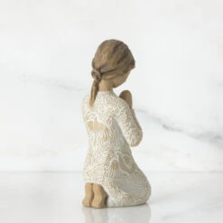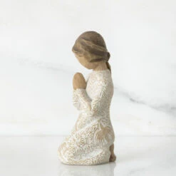 Willow Tree Prayer of Peace Figurine Size: 10cm Kneeling figure in cream dress with hands in prayer pose. Dress is heavily carved with birds and flowers. Gift to support and encourage hope and healing. Can be added to your Nativity display. “I wanted this prayer figure to be a humble piece, but very centering, calming, peaceful… with a universal gesture of meditative thought. The surface is carved with texture and patterns of living natural forms. Even though this is a quiet piece, I wanted the imagery to be very alive with movement – to have an inner energy of life.” – Susan Lordi Hand-painted resin figure. Dust with soft cloth or soft brush. Avoid water or cleaning solvents.