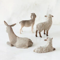Willow Tree Sheltering Animal Figurines for The Holy Family Size: 7.5 cm (tallest figurine) “Giving watch, warmth, protection” Gray-white standing goat; gray donkey, lying down with cream-colored blanket on back; two white sheep: one lying down, one standing, with dark face and feet. Sized to complement The Holy Family nativity set. This four-piece set of animals was designed to specifically fit the small, intimate scale of The Holy Family. “The Sheltering Animals are proportional in scale to The Holy Family… smaller versions of other animals I’ve carved, with a few little tweaks in the details. I like that the gestures of their heads and ears express watchful attentiveness. My favorite is the goat – he shows his personality in his stance!” – Susan Lordi Dust with soft cloth or soft brush. Avoid water or cleaning solvents.