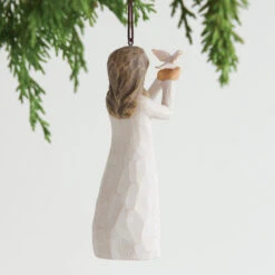 Willow Tree Soar Ornament Size: 13 cm “a time to reflect, a time to soar” Figure in cream dress, holding white dove on extended arms. A gift to encourage, support and acknowledge individual strength. “The gesture of the figure and the bird communicates forward movement… of new beginnings and of endings; in celebration of a life… or in anticipation of a life together. This piece could be a way to express best wishes to someone who is taking a new path in life; on a road to recovery from illness or toward self-improvement… A hopeful symbol of peace for military families awaiting the return of their solders… An expression of sympathy to someone who has lost a loved one.” – Susan Lordi Hand-painted resin ornament. Brown elastic cord for hanging. Dust with soft cloth or soft brush. Avoid water or cleaning solvents.