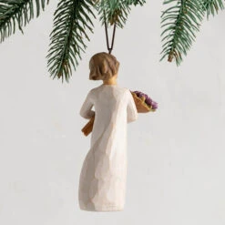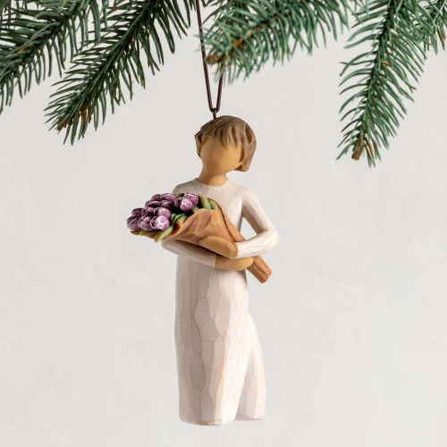 Willow Tree Cream Ornament Surprise Size: 10cm “A bouquet of wonderful wishes” Figure in cream dress, holding large bouquet of purple tulips. A gift to express best wishes, a congrats gift, perhaps for someone making life transitions or moving on to something new. A piece to welcome spring after a long winter or for those who love flowers. “When tulips bloom, they’re such a delightful surprise – a harbinger of spring… of longer days, sunshine, outdoor activity, new beginnings and refreshing changes. This ornament holding a bouquet of purple tulips could be given to a friend as a congrats gift, a get-well gift, a symbol of hopefulness and renewal. A bouquet of tulips can be the little surprise gift that lifts one’s spirits for no reason at all!” – Susan Lordi Hand-painted resin ornament. Brown elastic cord for hanging. Â