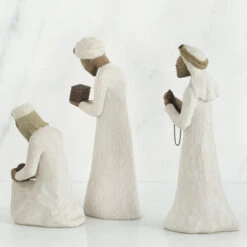 Willow Tree The Three Wise Men Figurines Size: 21.6cm (tallest figurine) “They followed a star and found the Light of the World” The Three Wise Men were created to accompany the scale of the Nativity collection. Three figures (kneeling, bowing and standing) in cream garments each carrying a metal vial or box. Dust with soft cloth or soft brush. Avoid water or cleaning solvents.